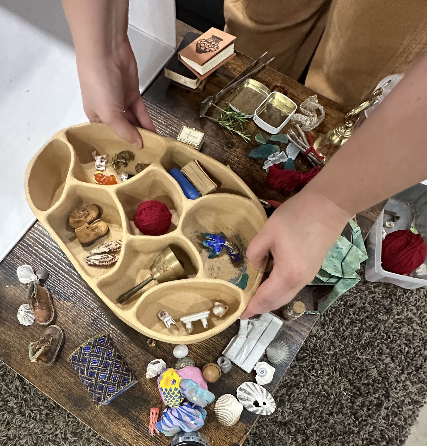 So I set up the studio. Bright desk, in. Bright chair, in. Bright curtains, in. Flowers painted on the wall around the costume closet (THE COSTUME CLOSET!). A shelf that’s just for tarot decks, and a shelf that’s just for zines. A whole wall set aside for art by friends. As I set it up, I found myself coveting treats and trinkets that I hadn’t thought about in almost 25 years. Suddenly, I am at the art supply, purchasing a unicorn figurine and a folio of ocean-themed stickers. Suddenly, I am raiding my parents’ basement and my childhood closet for the collection of tiny replica shoes that belonged to my grandma, and the brass bell, and my handwritten first-grade “novels”, and my Lilliputian German-English dictionary.